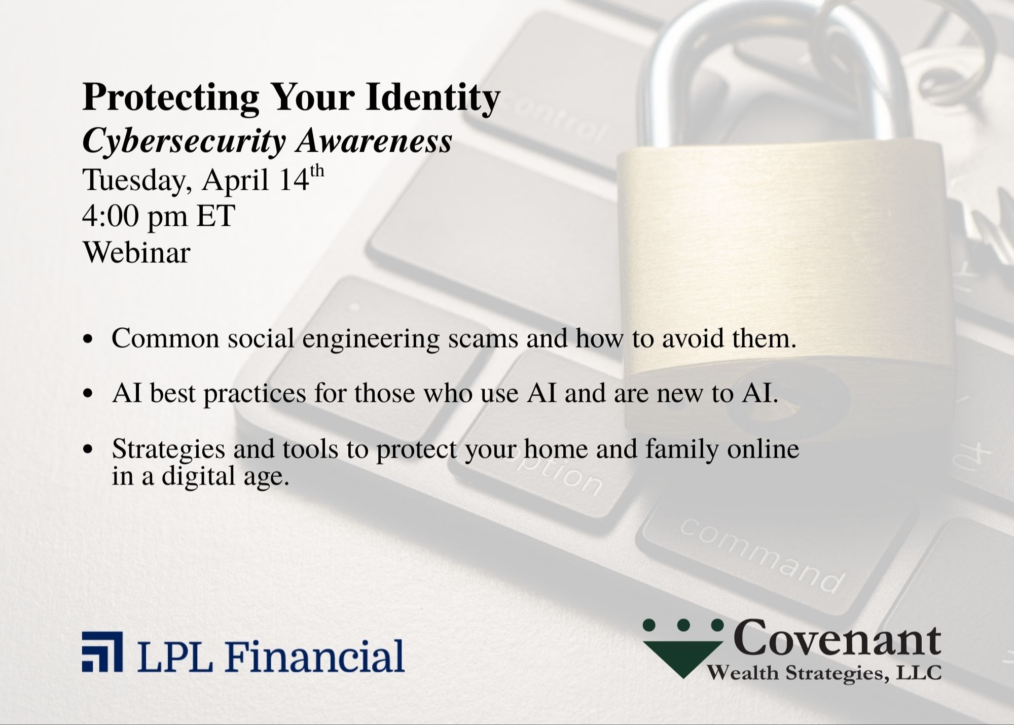 If you haven't registered already, we invite you to register for our upcoming cybersecurity webinar on Tuesday, April 14th at 4 pm ET for a practical, easy to follow conversation on: