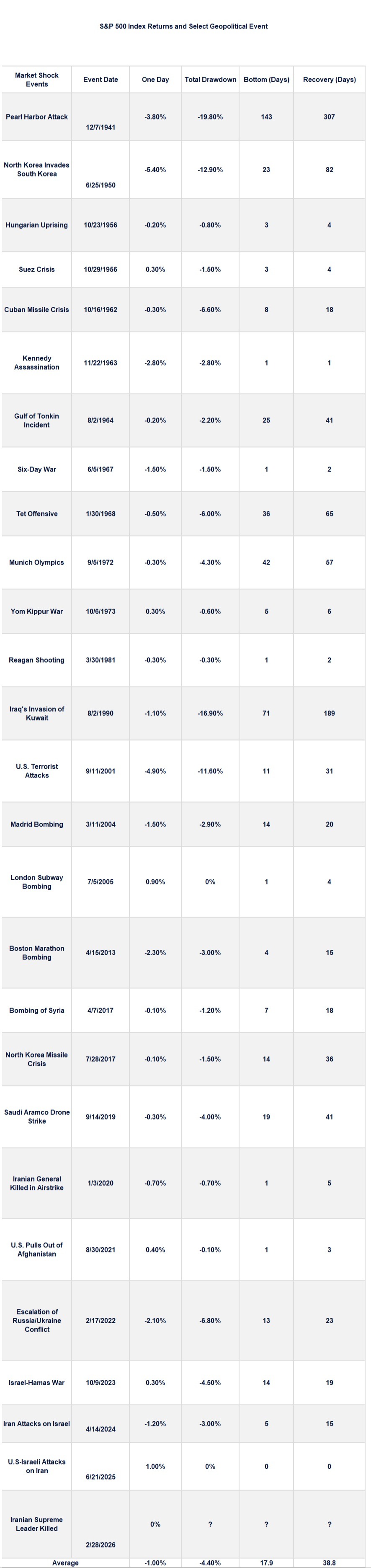 Reviewing market reactions across more than eight decades of market history helps us to understand how stocks typically behave when the unexpected happens, and which conditions matter most to determine the likely depth and duration of any drawdowns. It is important to note that past performance does not guarantee future results.